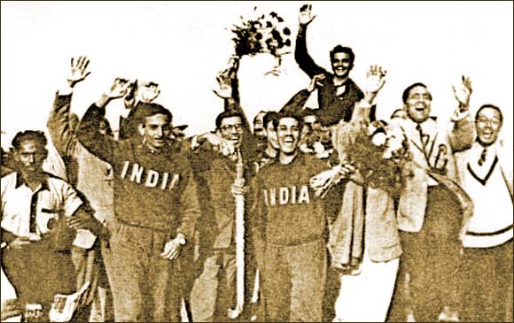 on his teammates' shoulders is captain K. D. Singh 'Babu'. He won